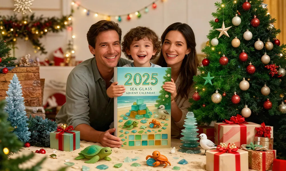Each calendar contains 24 unique fir trees. Because polished glass never repeats itself. Each fragment has its own story, its colour, its texture. Some come from bottles that spent decades in the ocean before washing up on the sand.